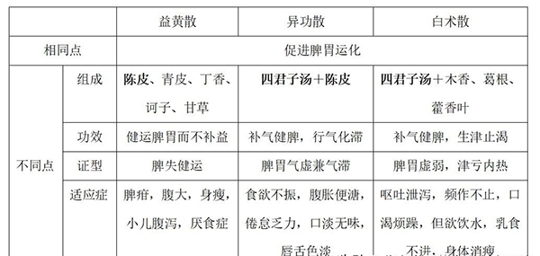 中医认为,脾胃是气机升降的枢纽,脾胃健运,气机调畅,才能保证饮食正常的消化和吸收。钱乙的健脾三方都能够调理中焦气机。但益黄散以健运脾胃为主,全方以理气行气药为主。而异功散和白术散都以四君子汤为基础,但异功散由四君子汤加陈皮组成,全方仍以补养脾胃为主,兼以健运;而白术散由四君子汤加木香、葛根、藿香叶组成,健脾助运的基础上还能够生津止渴。