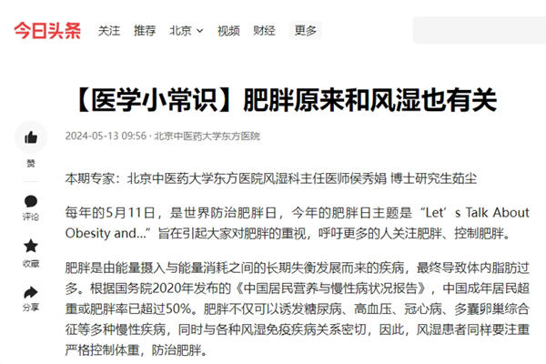 肥胖是由能量摄入与能量消耗之间的长期失衡发展而来的疾病,最终导致体内脂肪过多。根据国务院2020年发布的《中国居民营养与慢性病状况报告》,中国成年居民超重或肥胖率已超过50%。肥胖不仅可以诱发糖尿病、高血压、冠心病、多囊卵巢综合征等多种慢性疾病,同时与各种风湿免疫疾病关系密切,因此,风湿患者同样要注重严格控制体重,防治肥胖。