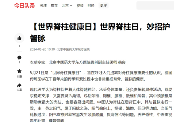 5月21日是“世界脊柱健康日”,旨在呼吁人们提高对脊柱健康重要性的认识。祖国传统医学在千百年来的传承积累过程中也非常重视脊骨、督脉的健康。